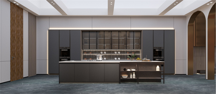 橱柜+智能岛台的空间布局,既节省了空间,也优化了家庭动线。厨房一半采用了嵌入式柜体,考究的布局和纯实木门让餐厨空间简约大气。岛台与烹饪区平行,空间明朗、清新自然。