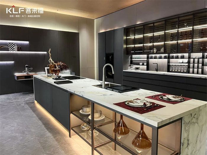 将客厅与开放式厨房打造成整体空间是升级的亮点之一,PET的工艺帮助米兰·(milan)实现嵌入式的内置功能,比如卫生间的灯光和冰箱。除此之外,整家定制也是米兰·(milan)今年的着力点,多功能的产品柜和开放式的设计模糊了空间界限。根据消费者对于一站式一体化的消费需求提供了解决方案。