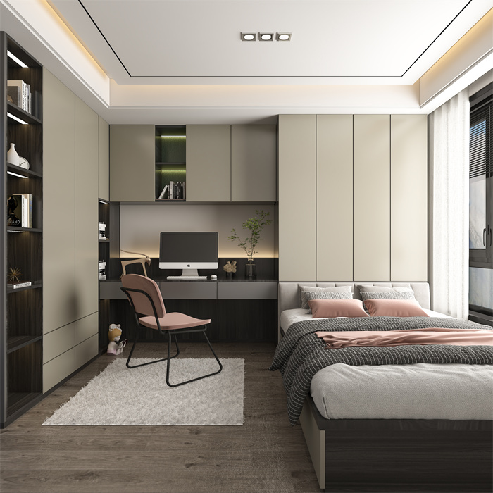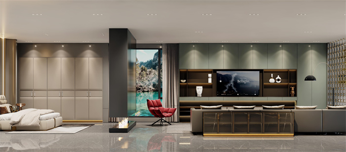 像电视柜的整体抬高设计,让业主在家即能舒适看剧;无把手柜门设计,简洁利落,增强视觉美感;衣柜的升降拉杆设计,满足家庭不同成员的需求。