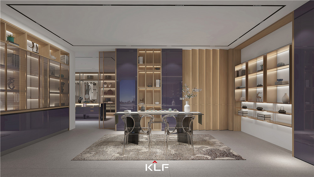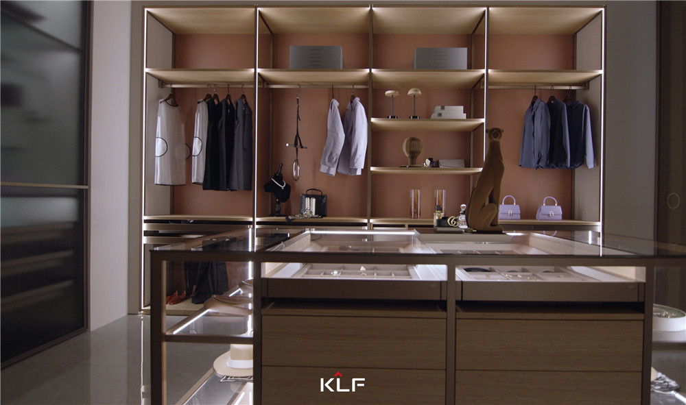 衣帽间采用金属雾银色框架+马尔斯玻璃+石青绿的高光背板,打造定制款的高端家居;铝木结合的开放式到顶衣柜通过法老金搭配科技橡木层板,提高空间利用率。